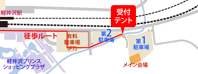 | 車両の途中退出について | 第1駐車場からの退出:朝入ったゲートからの退出となります。ショッピングモール前の渋滞を迂回するため、全車右折(碓氷峠方向)のみの退出となります。 | 第2駐車場からの退出:朝入った入口からの退出となります。第2駐車場は16時00分を過ぎると閉鎖しますので、16時00分までの退出をお願いします。 | |